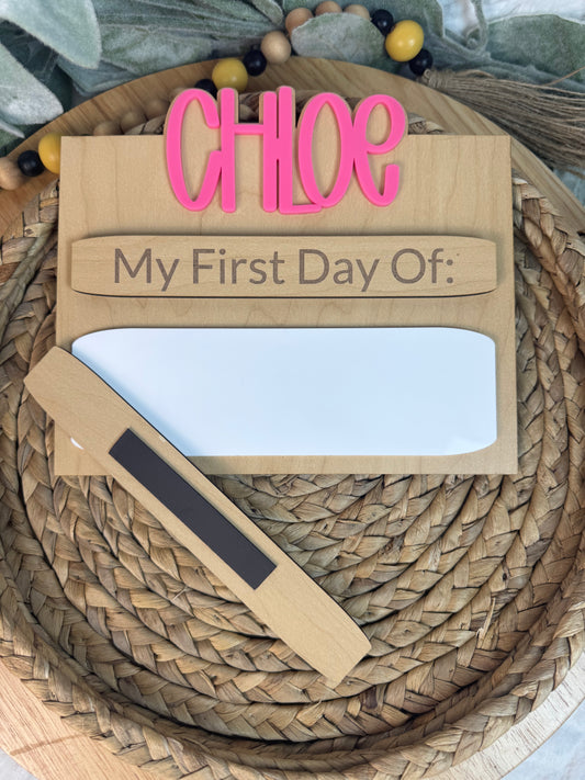 Custom First Day of School Sign with Name – Reusable Photo Prop with Magnetic Last Day Piece & Dry Erase Grade Area