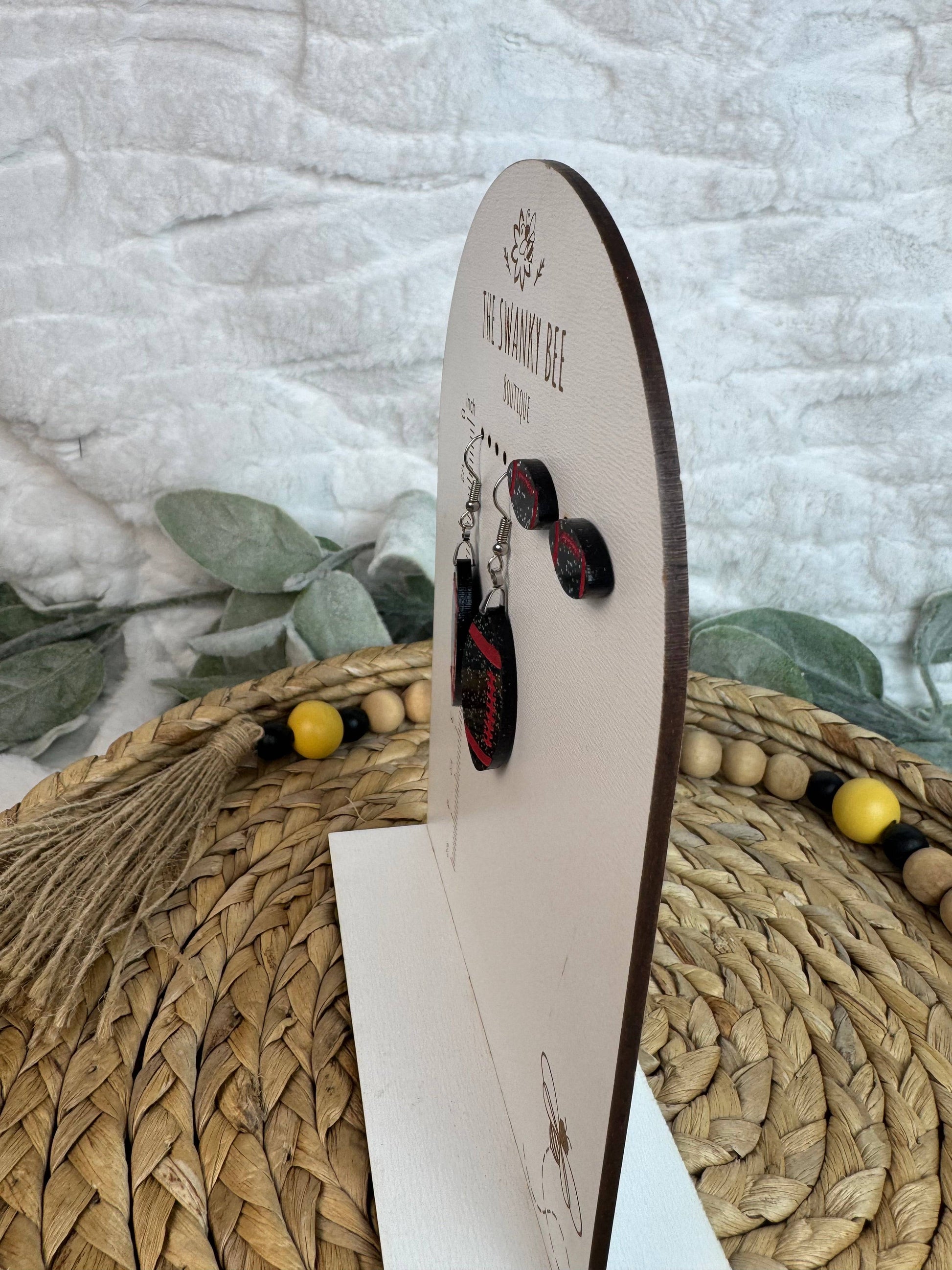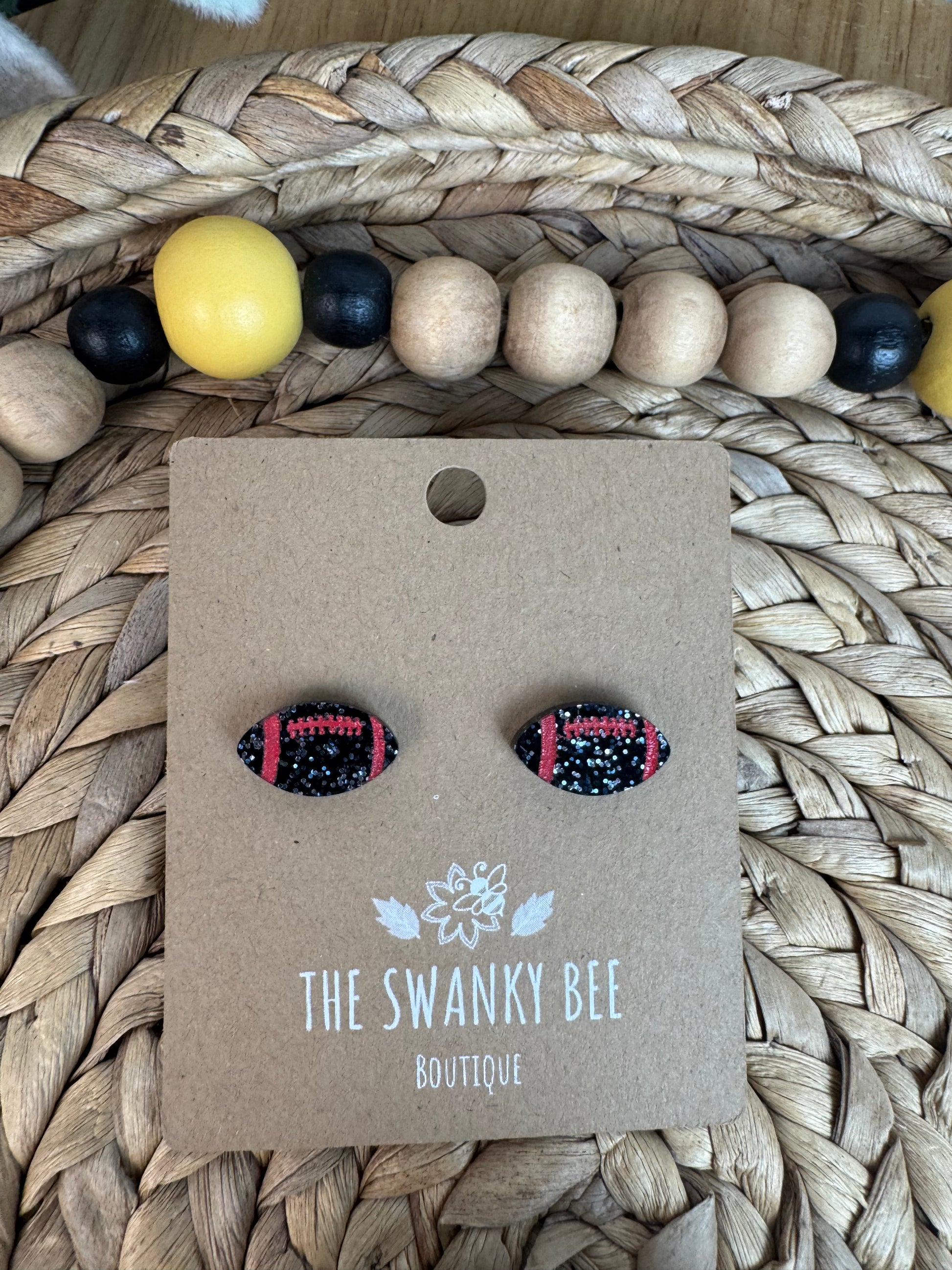 Black Glitter Football Earrings with Red Stripes – Stud or Dangle