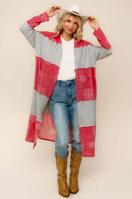 Stay cozy and stylish this winter in our Color Block Snowflake Print Duster Cardigan. Featuring a soft hacci knit with wide stripe color blocking and a festive snowflake design, this midi-length cardigan is perfect for layering over your favorite tops and jeans. It’s finished with side pockets and exposed seam detailing for that extra touch of casual charm.