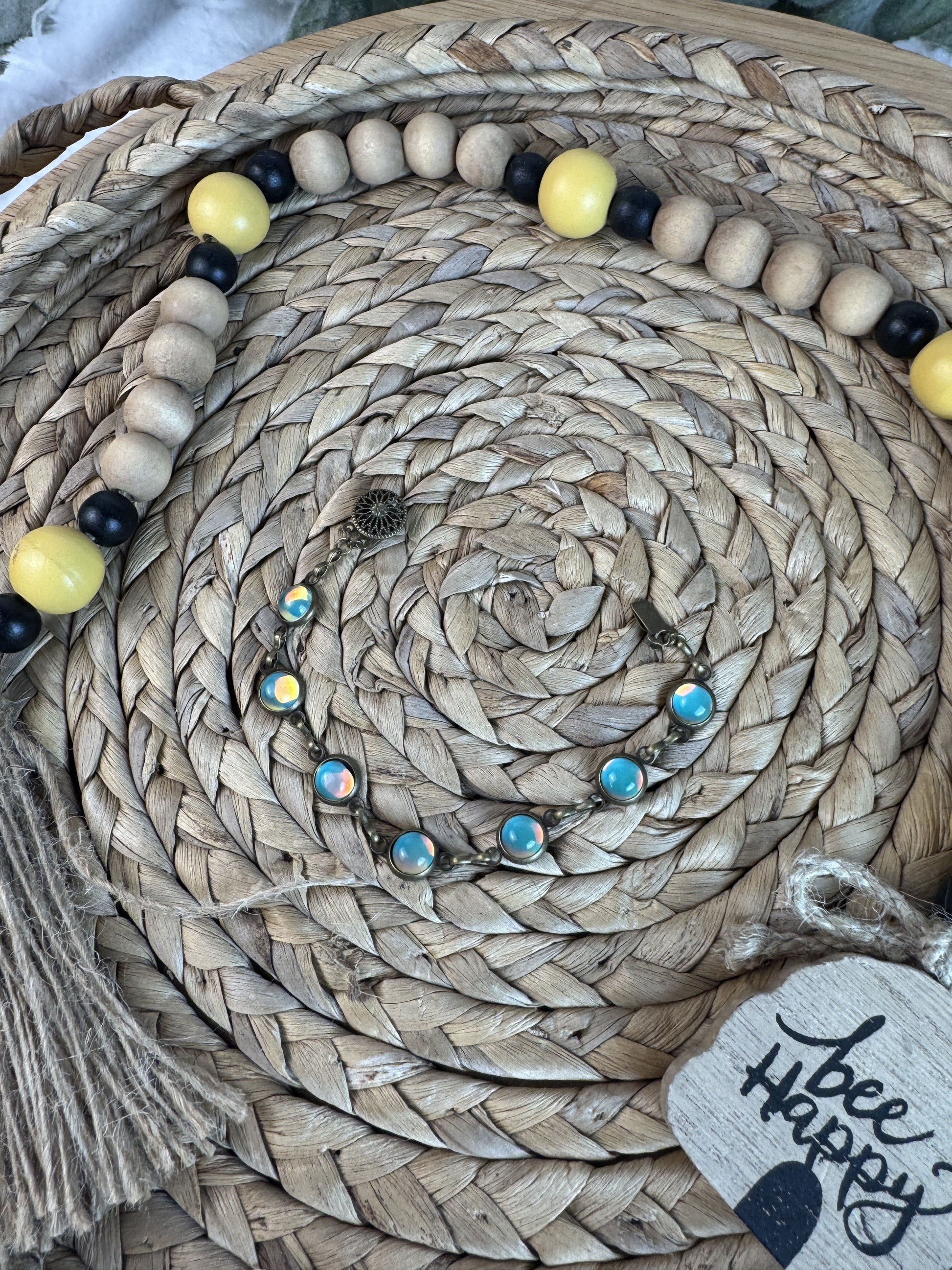 Add a touch of western charm with this stunning Glass Bead Western Bracelet. Featuring round iridescent glass beads set in antique brass-toned metal, this bracelet catches the light beautifully. The vintage-inspired design pairs perfectly with any boho or western look and includes a secure locking metal clasp for easy wear.