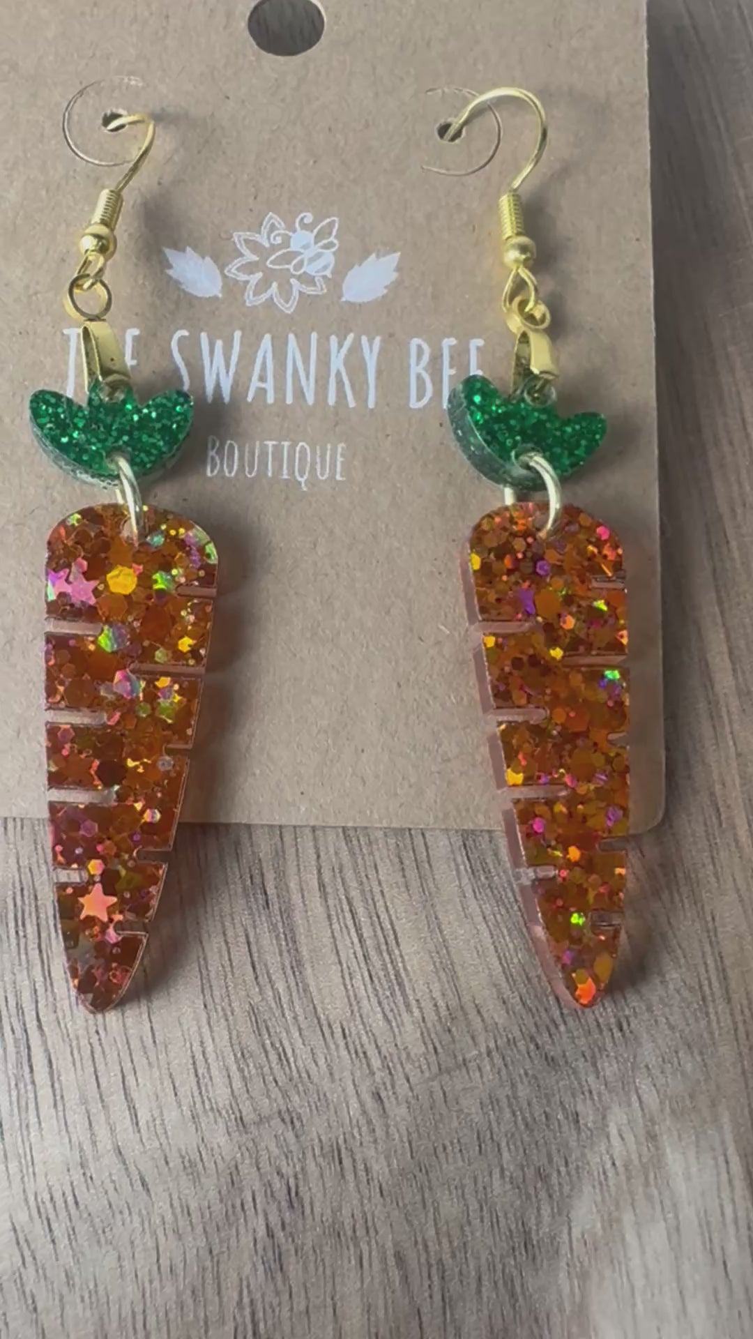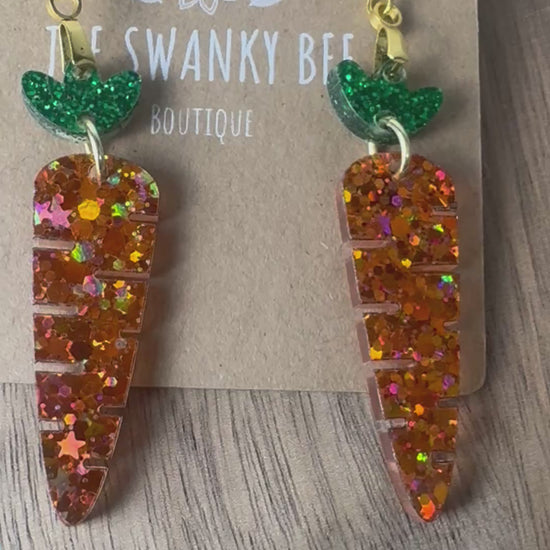 Add a pop of sparkle to your spring style with these adorable glitter carrot dangle earrings! Featuring a vibrant orange glitter carrot and a shimmery green top, these lightweight statement earrings are perfect for Easter outfits, spring festivals, or everyday fun.