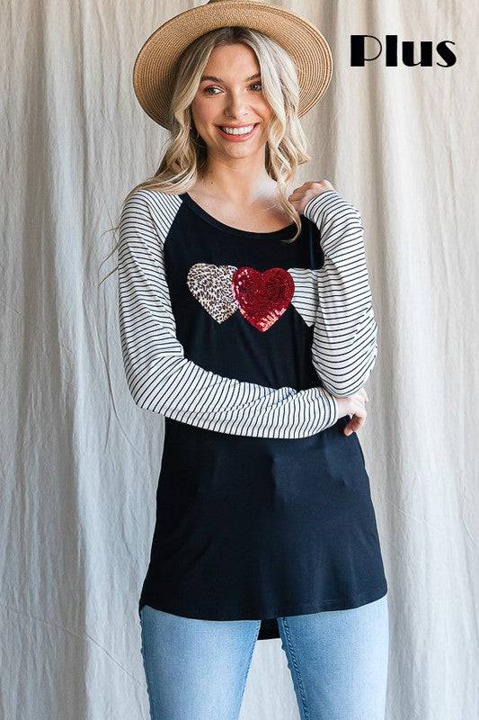 Add a sweet touch to your everyday style with this heart patch long sleeve top. Featuring three heart patches and pin stripe contrast details, this knit top blends cozy comfort with playful charm.