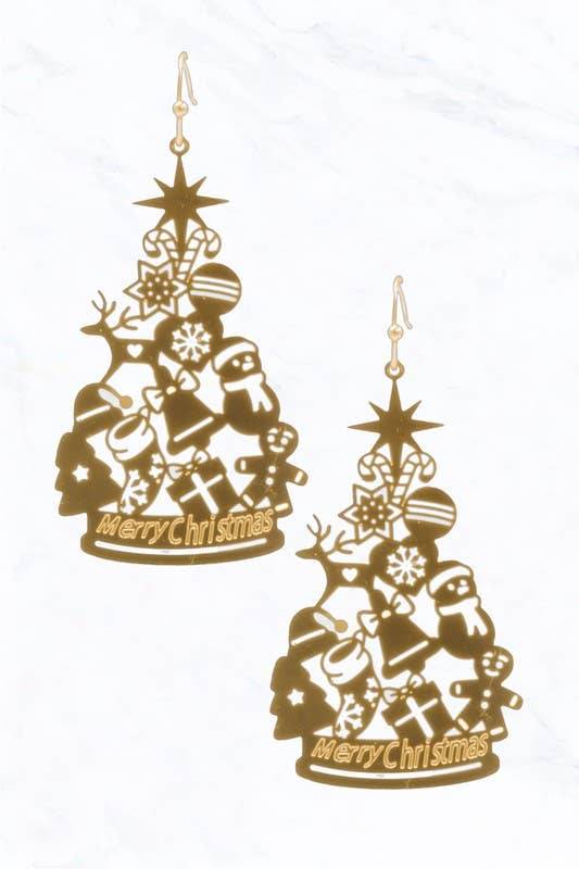 Add a touch of holiday cheer to your outfit with these festive Merry Christmas Tree Earrings. Crafted in a gold-tone finish, each earring features intricate Christmas designs including snowflakes, bells, and a cheerful “Merry Christmas” message. These lightweight statement earrings are perfect for holiday parties, teacher gifts, or anyone who loves to sparkle through the season. Measuring approximately 2.4" x 1.2", they are lead and nickel compliant. Made in China.