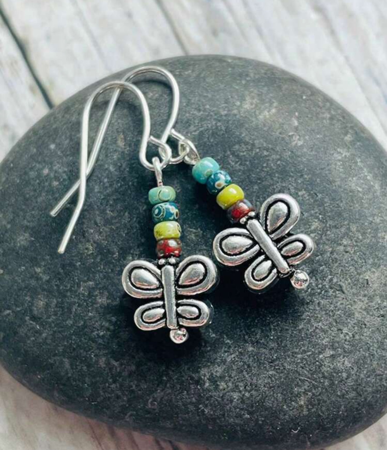 These charming silver butterfly earrings pair classic metal craftsmanship with vibrant multi-color natural stones for a timeless yet lively look. Lightweight and versatile, they add a touch of nature-inspired beauty to everyday outfits or special occasions, making them a perfect gift for any jewelry lover. 1" Drop.