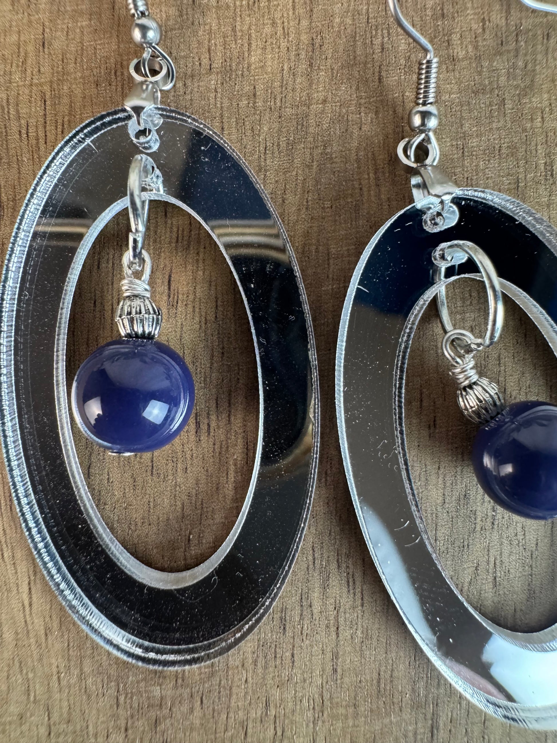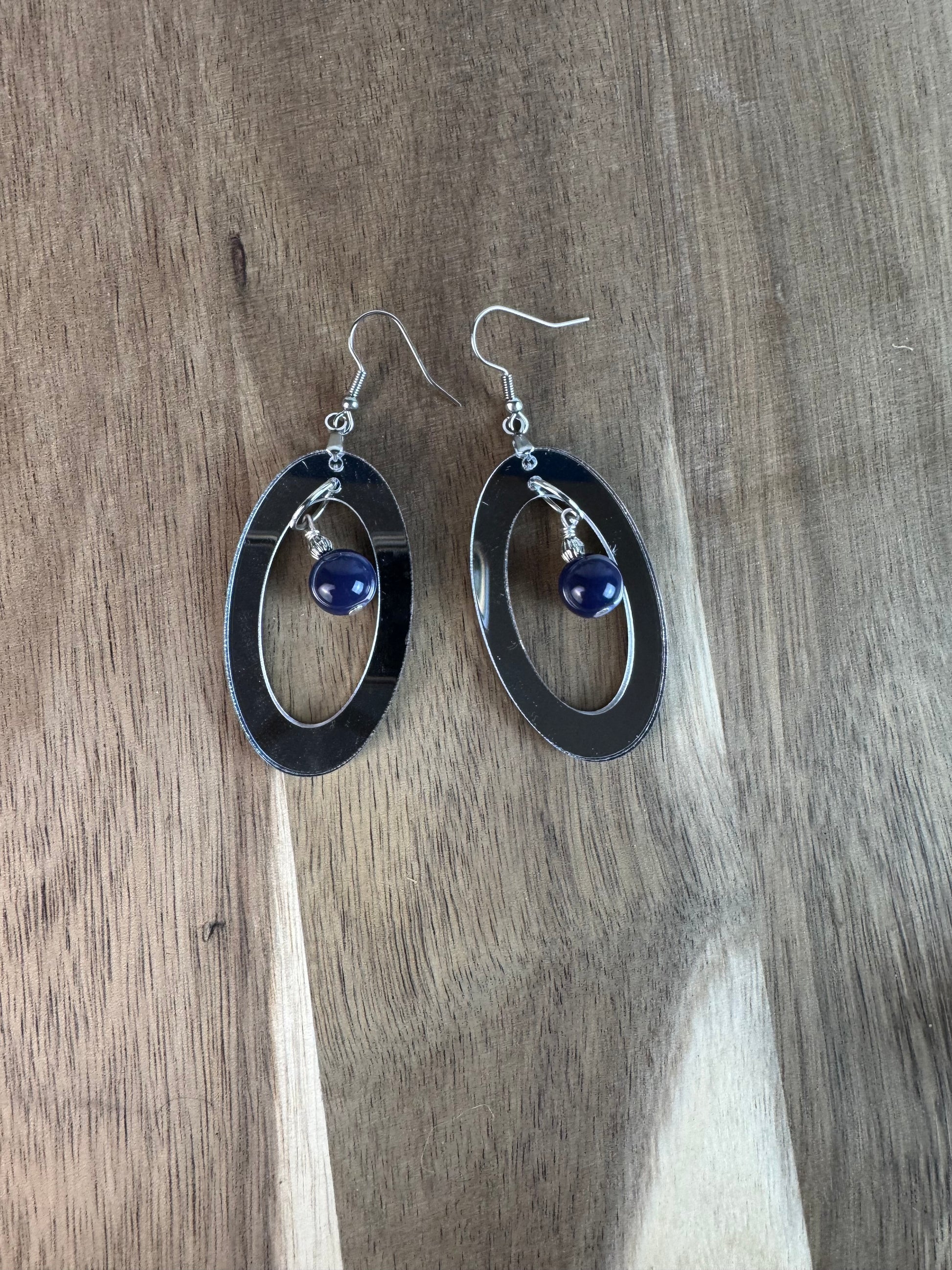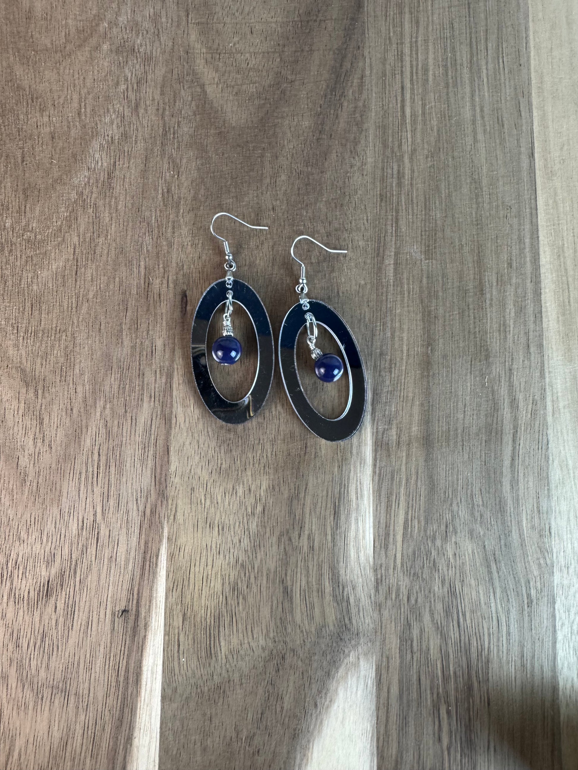 Silver Mirror Acrylic Oval Earrings with Blue Dangle Bead