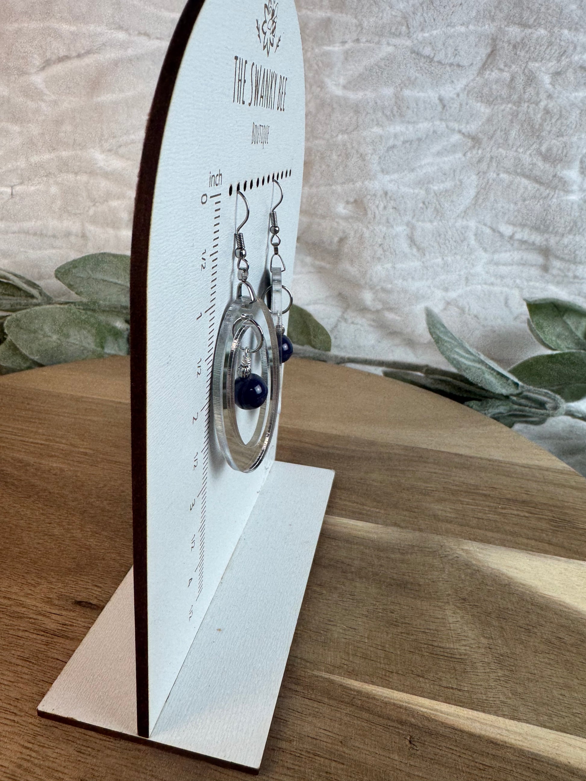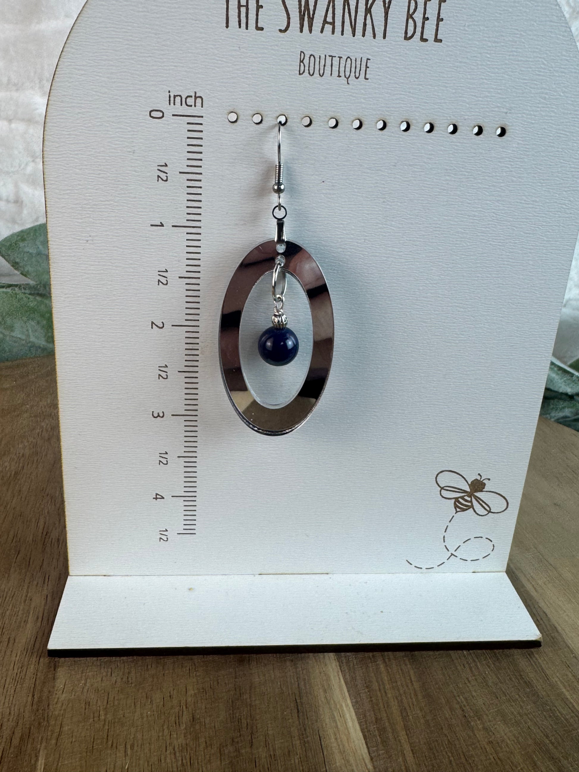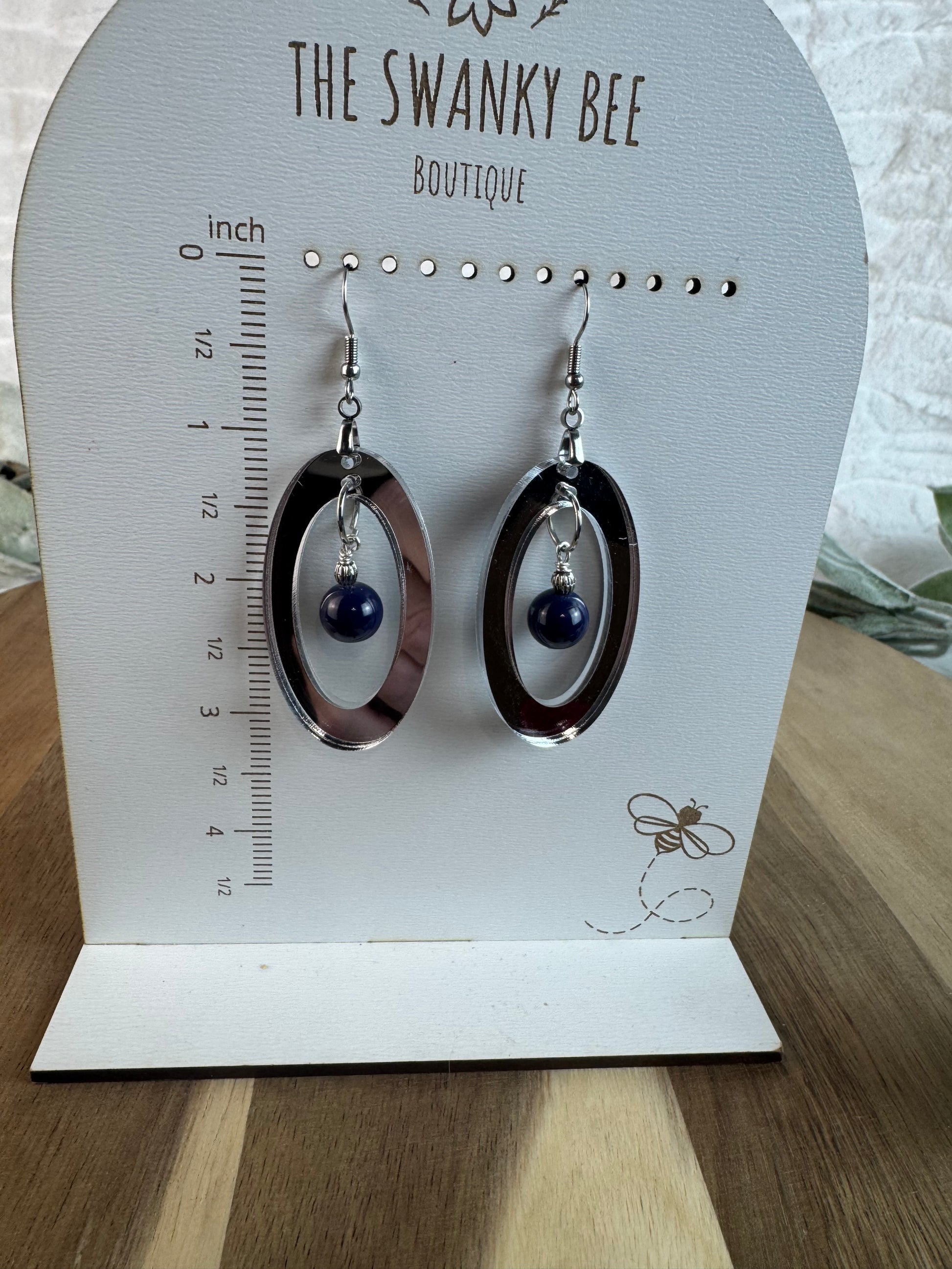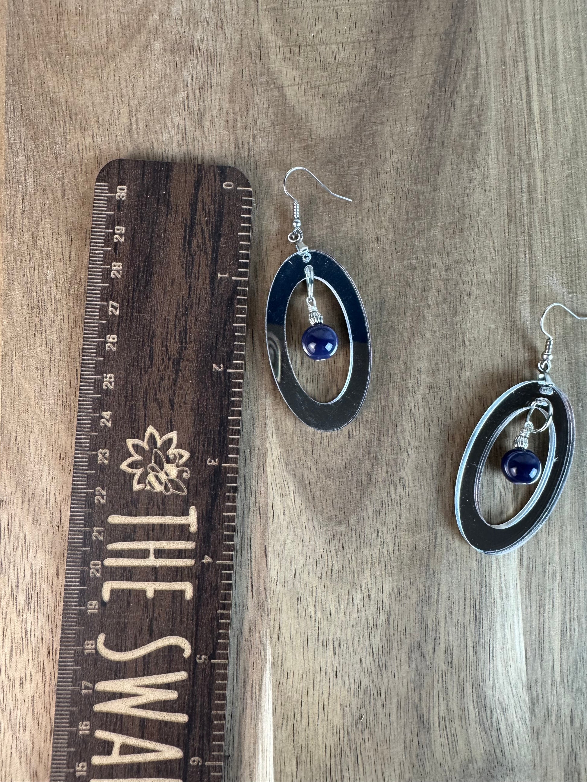 Silver Mirror Acrylic Oval Earrings with Blue Dangle Bead