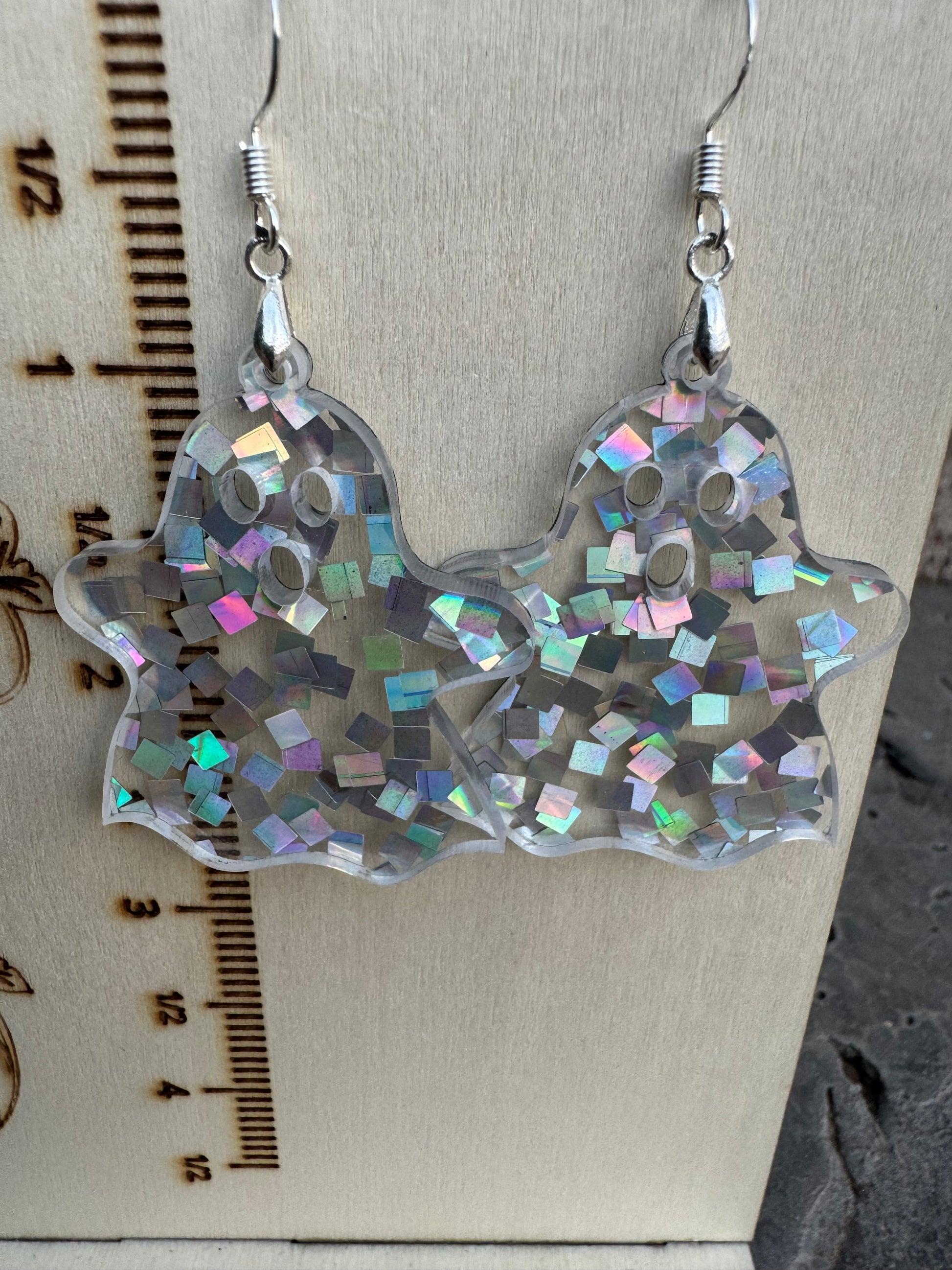 Add some spooky sparkle to your outfit with our Ghost Earrings! These earrings feature a 2.5" drop and are adorned with iridescent chunky glitter, creating a fun and unique look. Perfect for any Halloween party or costume, these earrings are sure to make a statement.