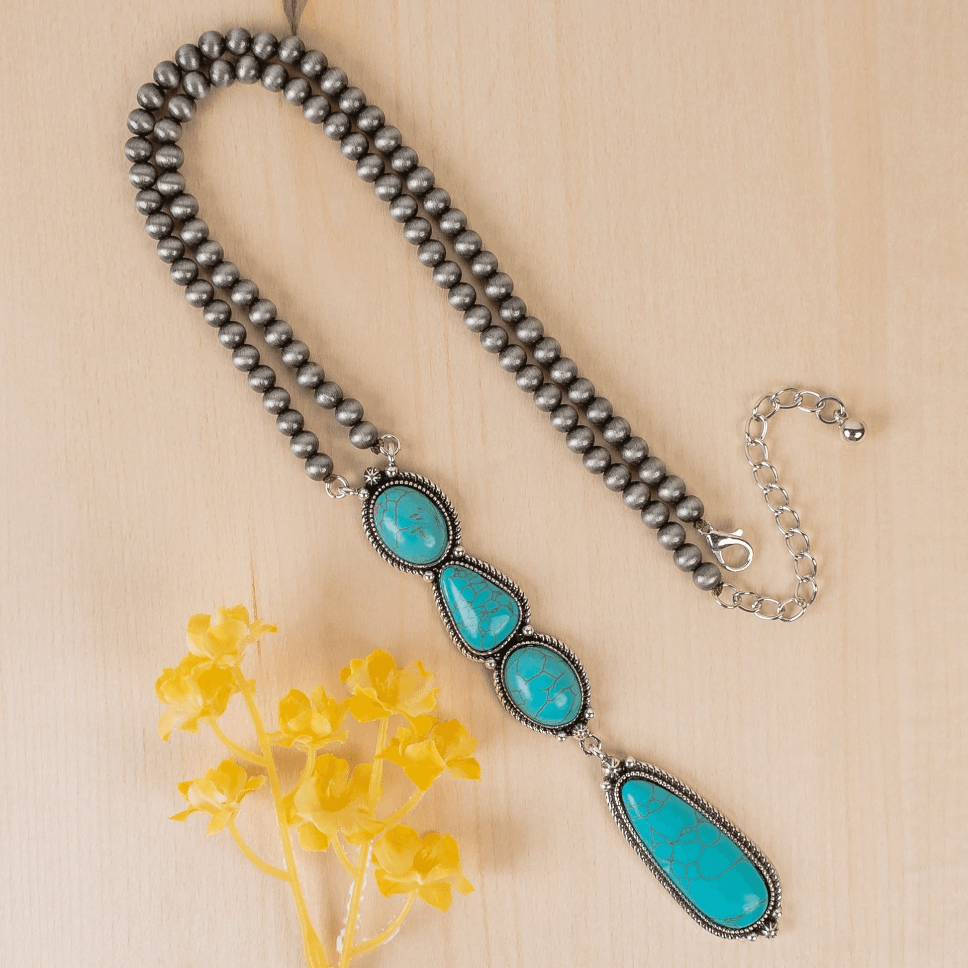 The necklace is crafted with Navajo-style pearls on a 24" beaded chain, giving it that authentic Western charm that pairs perfectly with denim, dresses, or your favorite graphic tee.