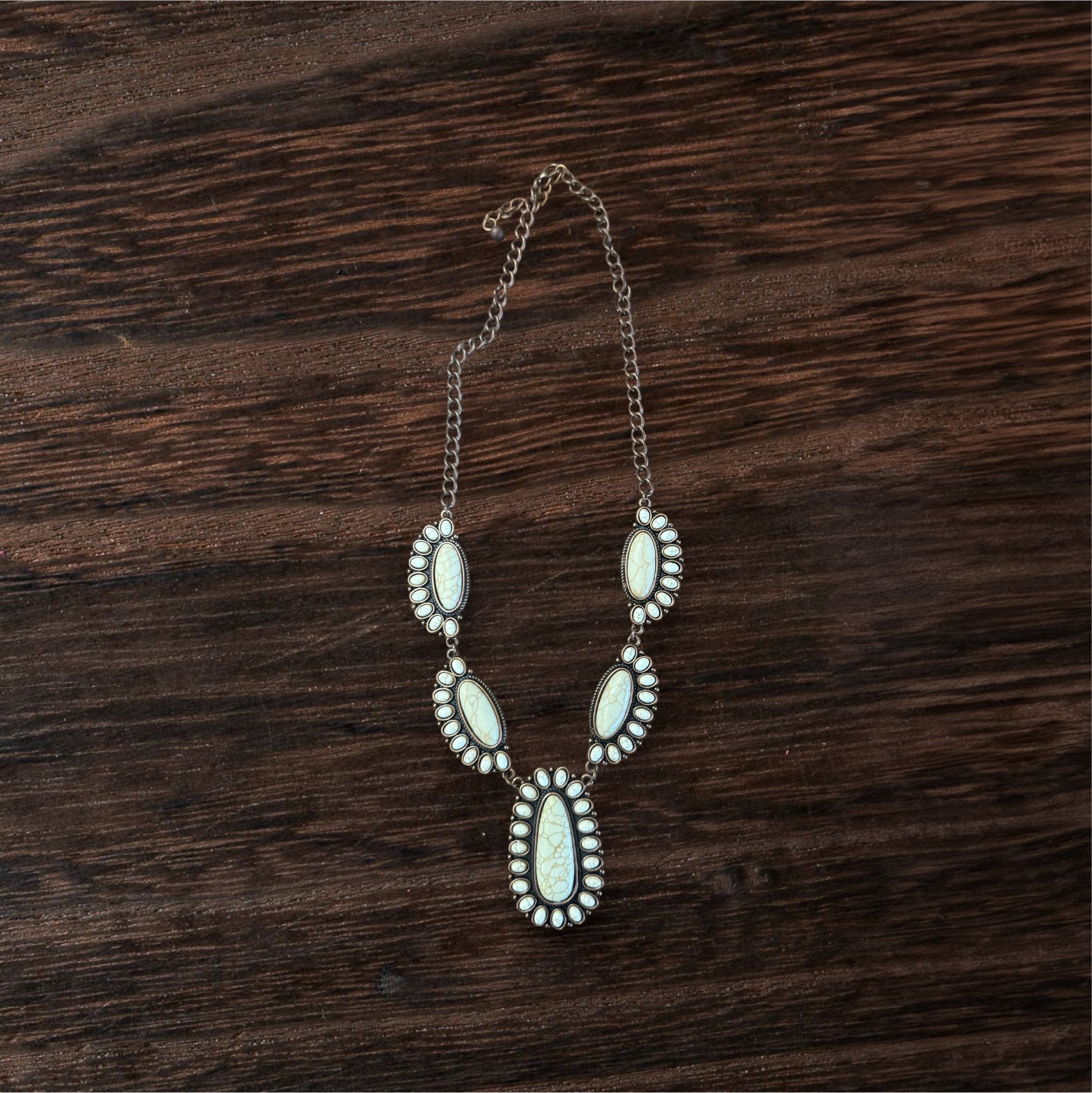Make a bold statement with this stunning Western-inspired necklace featuring cream marbled stones set in detailed antique copper frames. Each oval and teardrop-shaped stone is surrounded by petite beaded accents, creating an elegant, rustic charm that pairs beautifully with both dressy and casual looks.